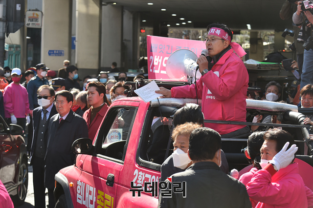 4.15 총선 서울 종로에 출마한 황교안 미래통합당 후보가 13일 서울 종로구 낙원상가 앞에서 지지를 호소하고 있다.