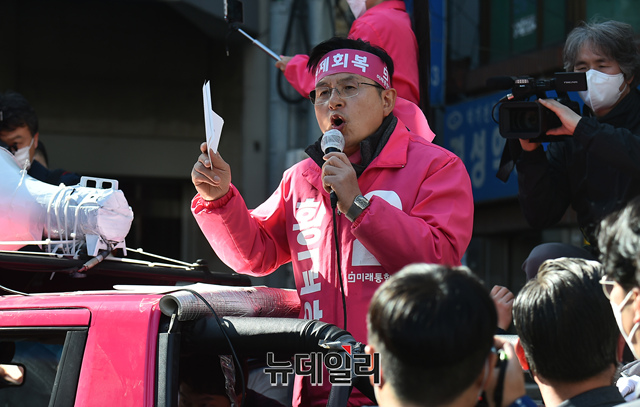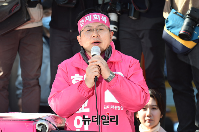 4.15 총선 서울 종로에 출마한 황교안 미래통합당 후보가 13일 서울 종로구 낙원상가 앞에서 지지를 호소하고 있다.