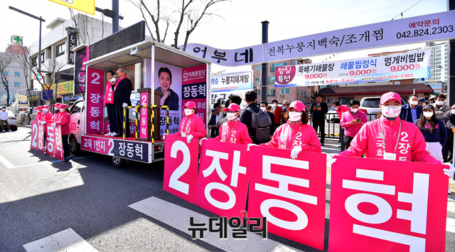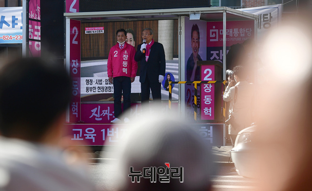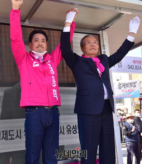 김종인 미래통합당 총괄선대위원장이 13일 오후 대전 유성구 유성시장 입구에서 장동혁 유성갑 후보와 손을 맞잡고 지지를 호소하고 있다. (대전=정상윤 기자)
