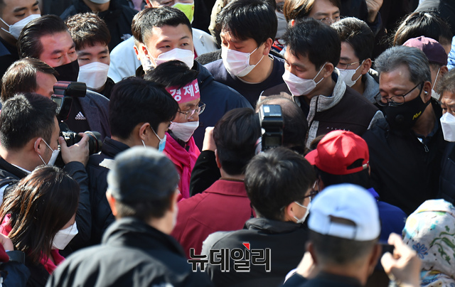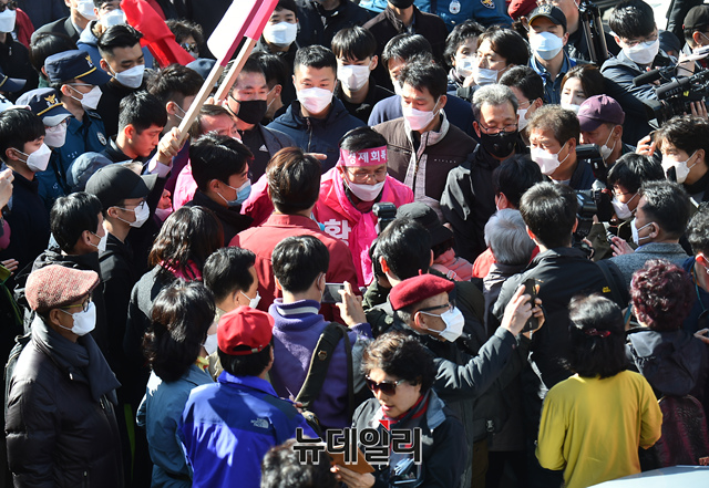 4.15 총선에서 서울 종로에 출마한 황교안 미래통합당 후보가 13일 서울 종로구 낙원상가 앞에서 유세를 마치고 지지자들과 인사를 나누고 있다.