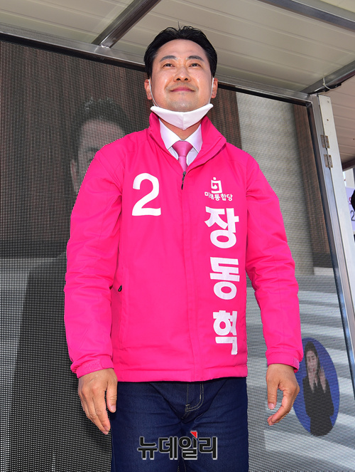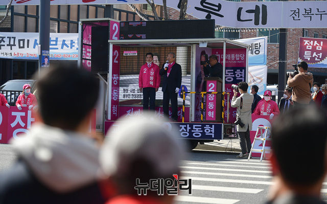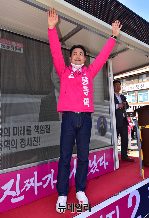 장동혁 미래통합당 대전 유성구갑 국회의원 후보가 13일 오후 대전 유성구 유성시장 입구에서 손을 흔들며 지지를 호소하고 있다. 이날 유세장에는 김종인 총괄선대위원장이 방문해 장 후보의 지지를 호소했다. (대전=정상윤 기자)