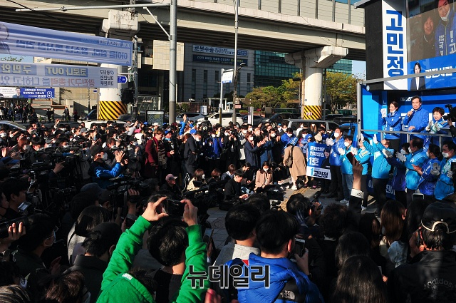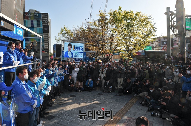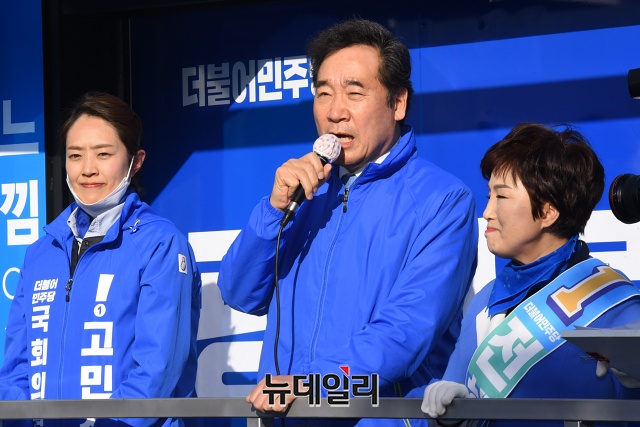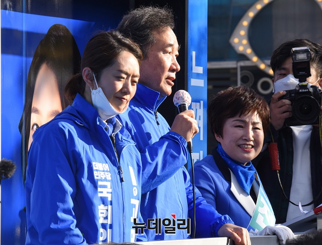 이낙연 더불어민주당 상임공동선대위원장이 13일 오후 서울 광진구 건대입구 사거리에서 전혜숙 광진갑 후보, 고민정 광진을 후보와 유세차량에 올라 지지호소를 하고 있다.