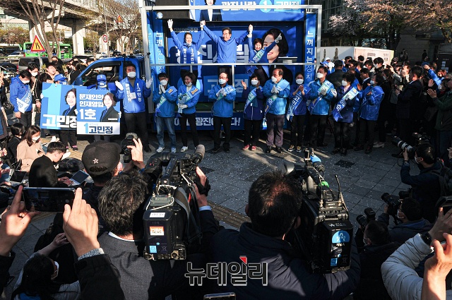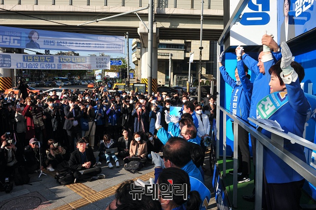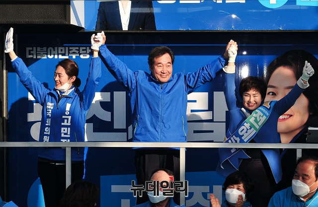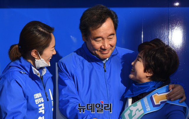 이낙연 더불어민주당 상임공동선대위원장이 13일 오후 서울 광진구 건대입구 사거리에서 전혜숙 광진갑 후보, 고민정 광진을 후보와 손을 맞잡고 기념촬영을 하고 있다.