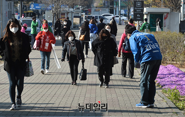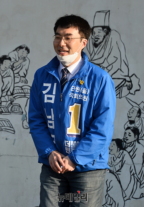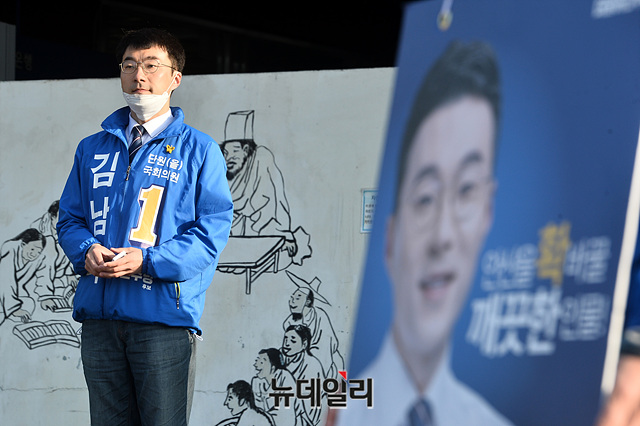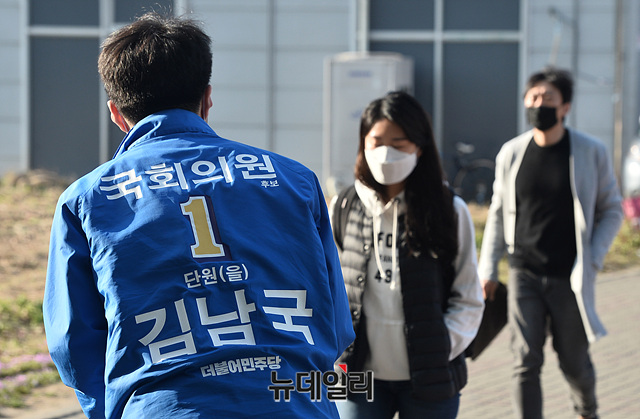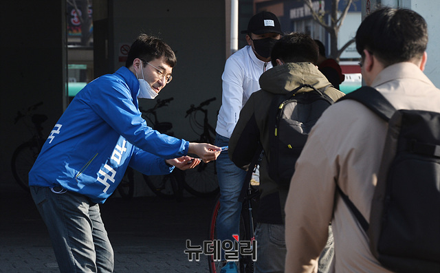김남국 더불어민주당 경기 안산시단원구을 후보가 14일 오전 경기 안산시 중앙역 앞에서 시민들에게 명함들 건내며 지지를 호소하고 있다. (경기 안산=박성원 기자)