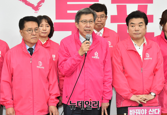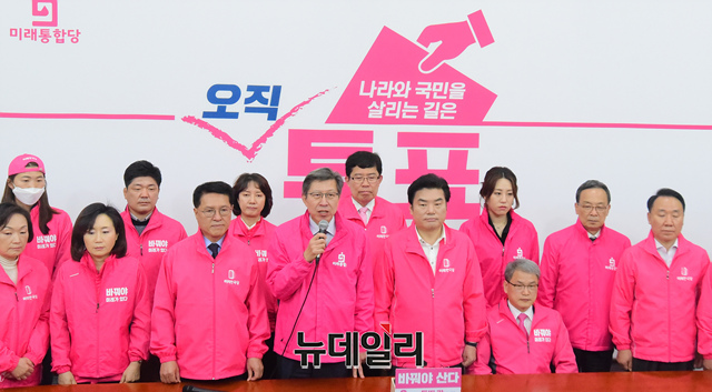 박형준 미래통합당 공동선거대책위원장이 14일 오전 국회에서 열린 미래통합당·미래한국당 '둘째칸 찍기 캠페인 합동 퍼포먼스'에 앞서 모두발언을 하고 있다.