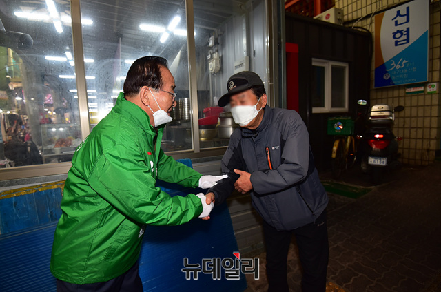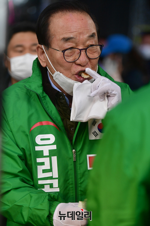서청원 우리공화당 상임선대위원장이 선거운동 마지막날인 14일 오후 대구 중구 서문시장을 방문해 시장음식을 맛보고 있다. 서 선대위원장은 우리공화당 추천 2순위 비례대표 후보에 이름을 올렸다. (대구=정상윤 기자)