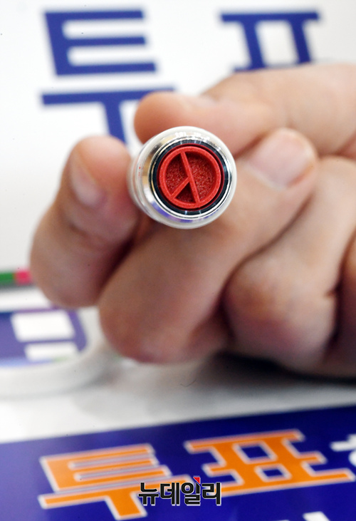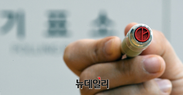 4.15 총선을 하루 앞둔 14일 오후 서울 종로구 청운효자동 제1투표소가 마련된 청운초등학교 체육관에서 투표사무원이 기표용구를 들어 보이며 투표 참여를 독려하고 있다.