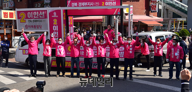박형준 미래통합당 공동선대위원장이 14일 오후 대구 수성구 용지아파트 입구에서 열린 합동유세에서 후보들과 손을 맞잡고 승리를 다짐하고 있다. 이날 합동유세에는 주호영 수성갑, 이인선 수성을, 곽상도 중구남구, 윤재옥 달서을 후보가 참석했다. (대구=정상윤 기자)