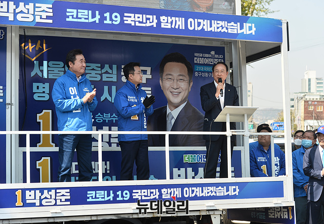 제21대 국회의원선거(이하 총선)를 하루 앞둔 14일 오후 최운열 더불어민주당 의원이 서울 종로구 마전교 앞에서 이낙연 서울 종로구 후보, 박성준 서울 중구성동구을 후보 지원유세를 하고 있다.이번 총선은 국회의원 300명(지역구 253석·비례대표 47석)을 뽑는 선거로 15일(내일) 오전 6시부터 오후 6시까지 투표할 수 있다.만 18세 이상의 국민이면 투표 가능하며 본인의 주민등록증이나 여권, 운전면허증 등 신분증을 지참해야 한다. 또한 '코로나19(중국 우한 폐렴)' 확산 방지를 위해 투표장에서는 마스크를 꼭 착용해야 한다.