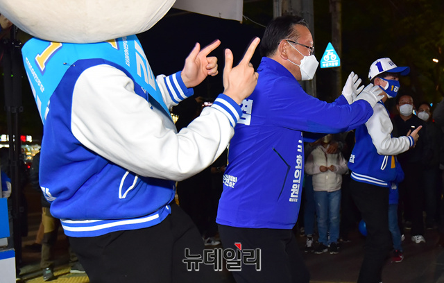 김부겸 더불어민주당 대구 수성갑 국회의원 후보가 14일 오후 대구 수성구 신매광장입구에서 열린 집중유세에서 선거유세원들과 춤을 추고 있다. (대구=정상윤 기자)