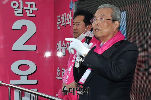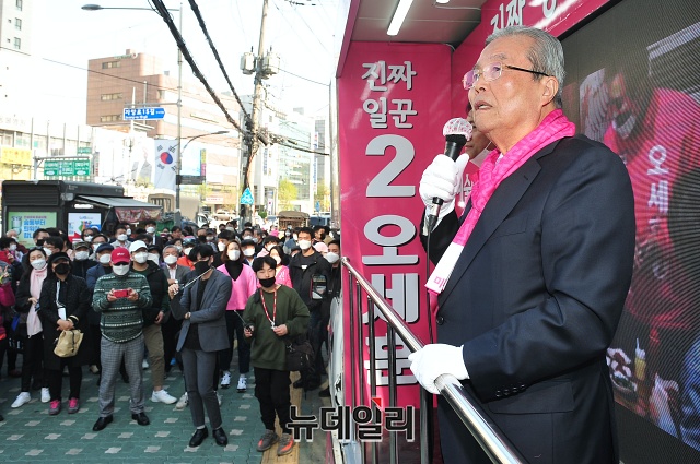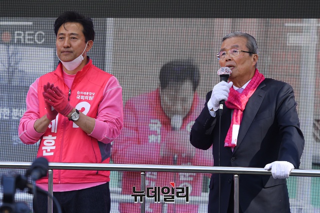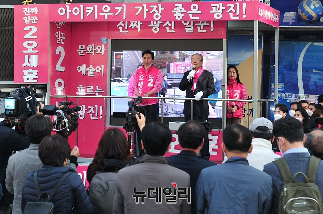 김종인 미래통합당 총괄선대위원장이 14일 오후 서울 광진구 자양네거리에서 오세훈 광진을 후보와 유세차량에 올라 지지호소를 하고 있다.