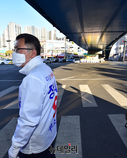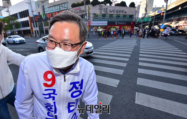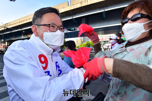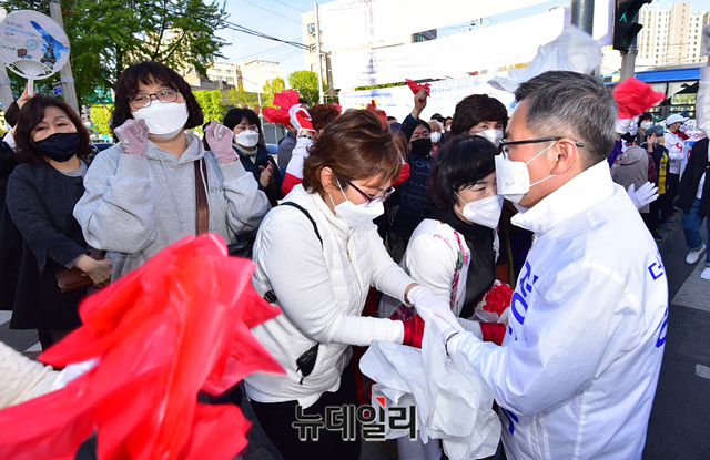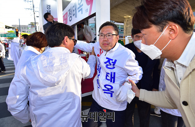 정태옥 무소속 대구 북구갑 국회의원 후보가 14일 오후 대구 북구 복현오거리에서 유세를 마치고 유세장을 찾은 지지자들과 악수를 나누고 있다. 대구 북구갑 지역은 민주당 이헌태, 통합당 양금희, 정의당 조명래, 공화당 김정준, 배당금당 장금진, 무소속 정태옥 후보가 경쟁 중이다. (대구=정상윤 기자)