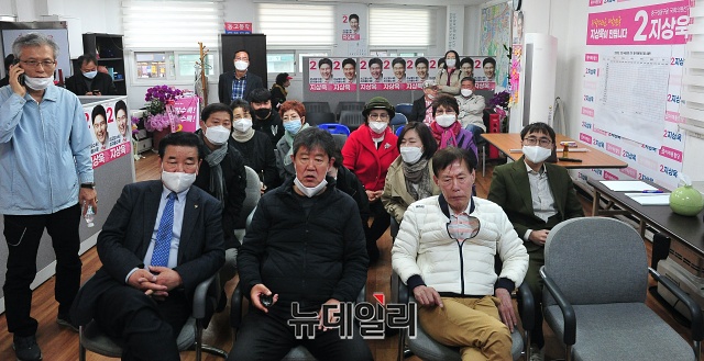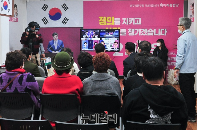 지상욱 미래통합당 중구성동구을 후보 지지자들이 15일 오후 서울 중구 지 후보 선거사무소에서 21대 총선 출구조사 결과를 보고 있다.