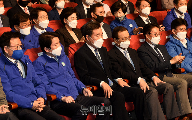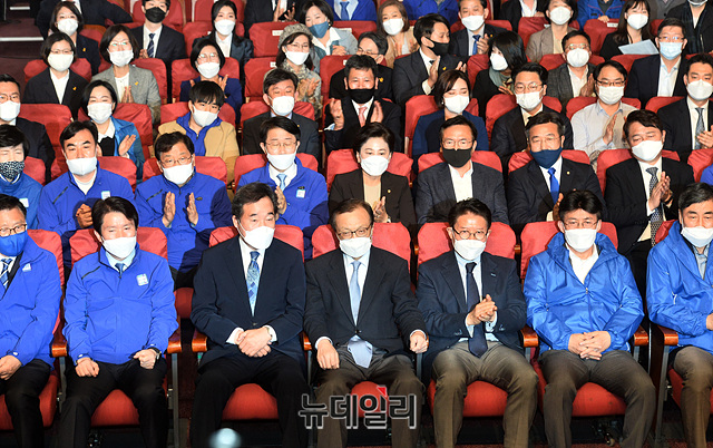 이해찬 더불어민주당 대표, 이낙연 상임선대위원장, 이인영 원내대표 등 참석자들이 15일 오후 국회 의원회관에 마련된 더불어민주당-더불어시민당 제21대 국회의원 선거 개표상황실에서 출구조사 결과 발표를 시청하고 있다.