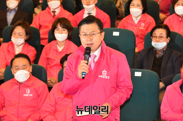 황교안 미래통합당 대표가 4.15 총선일인 15일 오후 국회 도서관 대강당에 마련된 개표 상황실에서 당직자들과 출구조사 방송을 시청한 후 조사 결과 관련 발언을 하고 있다.