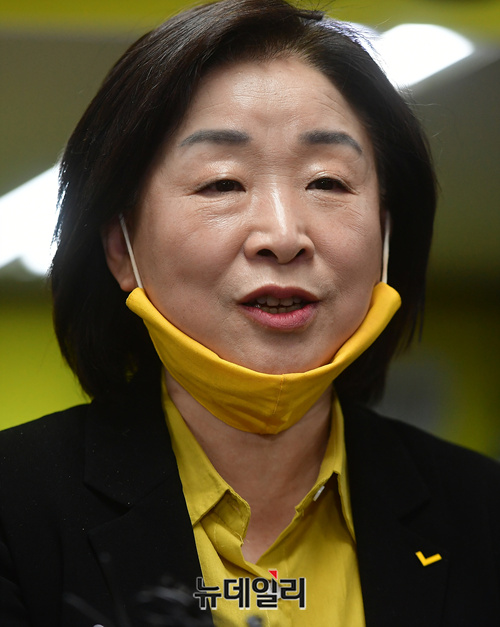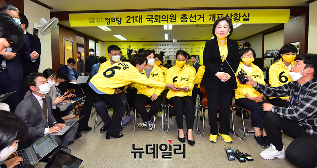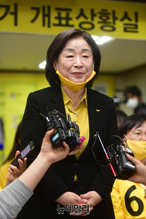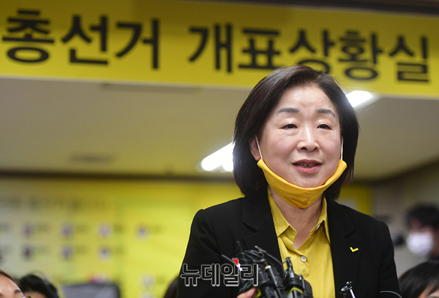 심상정 정의당 대표가 선거가 마무리된 15일 오후 서울 여의도 당사에서 출구조사 결과를 보고 취재진의 질문에 답하고 있다.