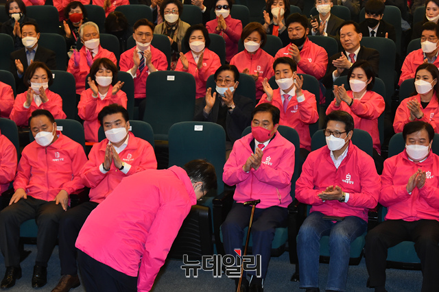 황교안 미래통합당 대표가 4.15 총선일인 15일 오후 국회 도서관 대강당에 마련된 개표 상황실에서 당직자들과 출구조사 방송을 시청한 후 인사를 하고 있다.