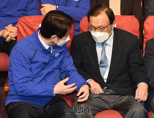 이해찬 더불어민주당 대표, 이인영 원내대표가 15일 오후 국회 의원회관에 마련된 더불어민주당-더불어시민당 제21대 국회의원 선거 개표상황실에서 대화를 나누고 있다.