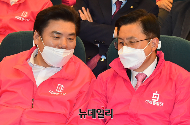 황교안 미래통합당 대표와 원유철 미래한국당 대표가 4.15 총선일인 15일 오후 국회 도서관 대강당에 마련된 개표 상황실에서 대화를 나누고 있다.