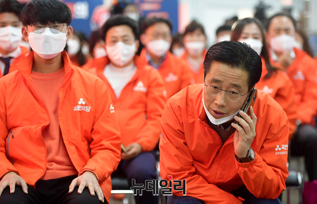 이태규 국민의당 총괄선거본부장을 비롯한 당직자들이 15일 오후 서울 마포구 국민의당사에서 21대 총선 출구조사 결과를 보고 있다. 국민의당은 이번 총선에 지역구 후보를 내지 않았다.