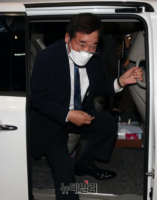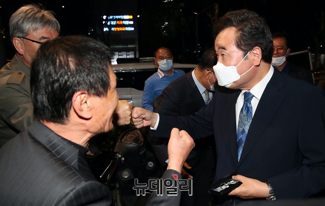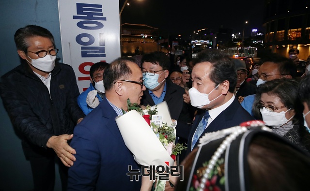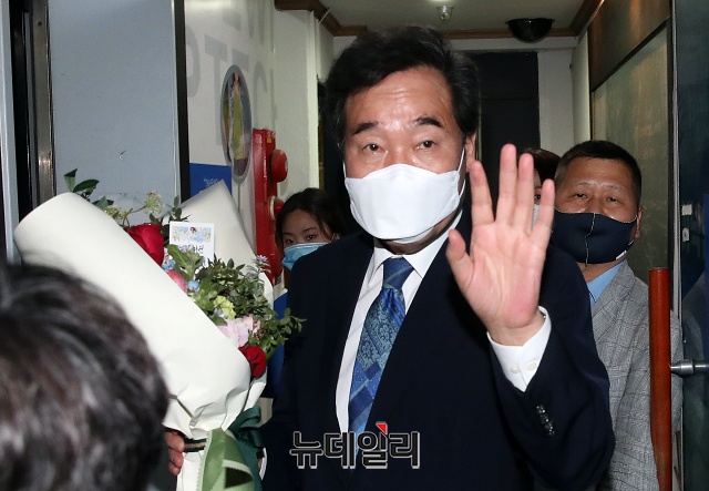 이낙연 더불어민주당 종로구 후보가 15일 오후 서울 종로구 선거사무소에서 지지자들로부터 꽃다발을 받고 입장하고 있다.