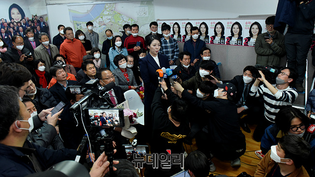 배현진 미래통합당 서울 송파구을 후보가 16일 새벽 서울 송파구 배 후보의 선거사무소에서 당선이 확실시 되자 소감을 밝히고 있다.