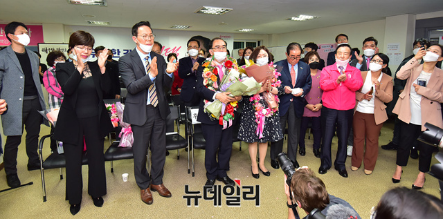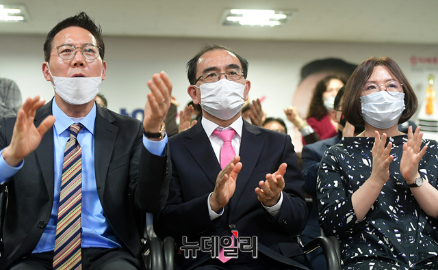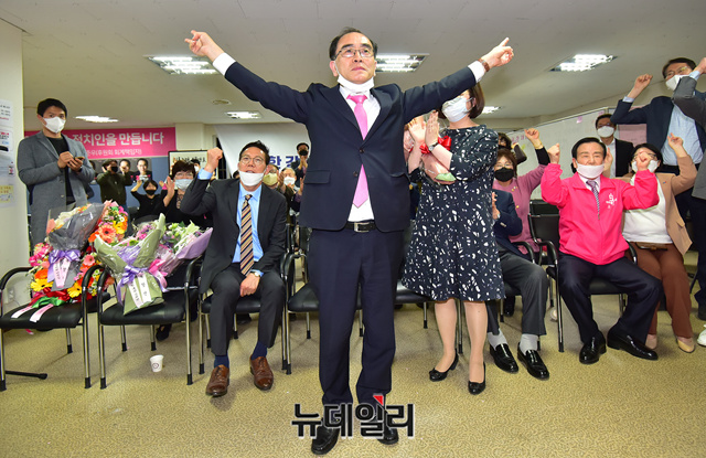 태구민 미래통합당 강남갑 국회의원 후보가 16일 새벽 서울 강남구 선거사무소에서 당선확정이 되자 손을 들어 환호하고 있다. 태구민 후보는 탈북민으로 한국에서 치러진 국회의원 선거에서 당선된 첫 인사가됐다.