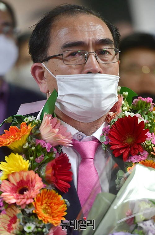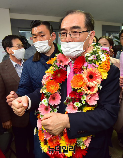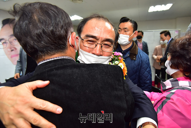 태구민 미래통합당 강남갑 국회의원 후보가 16일 새벽 서울 강남구 선거사무소에서 당선확정을 짓고 선거원들과 인사를 나누고 있다. 태구민 후보는 탈북민으로 한국에서 치러진 국회의원 선거에서 당선된 첫 인사가됐다.