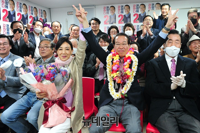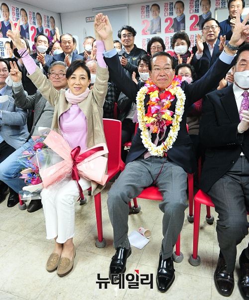 [포토] 당선 확정에 기념촬영 갖는 권영세 후보 내외