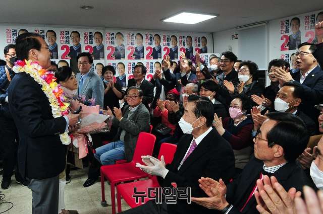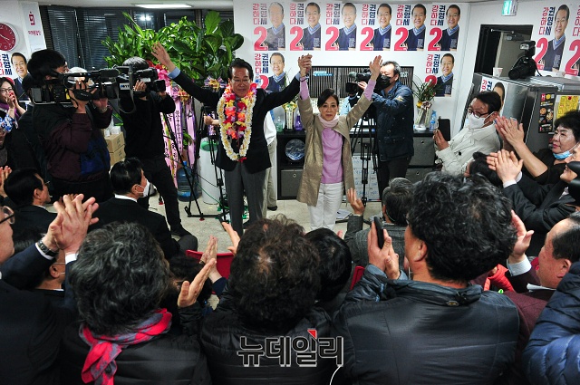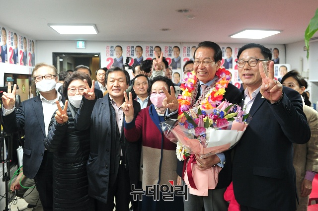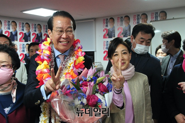 권영세 미래통합당 용산구 후보가 16일 오전 서울 용산구 선거사무소에서 당선을 확정짓고 지지자들에게 감사 인사를 전하고 있다.