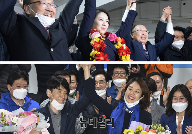 MBC 아나운서 출신 배현진 미래통합당 후보와 KBS 아나운서 출신 고민정 더불어민주당 후보가 16일 새벽 서울 송파구와 광진구에 위치한 각자의 선거사무소에서 당선을 확정 짓고 손을들고 기념촬영을 하고 있다.