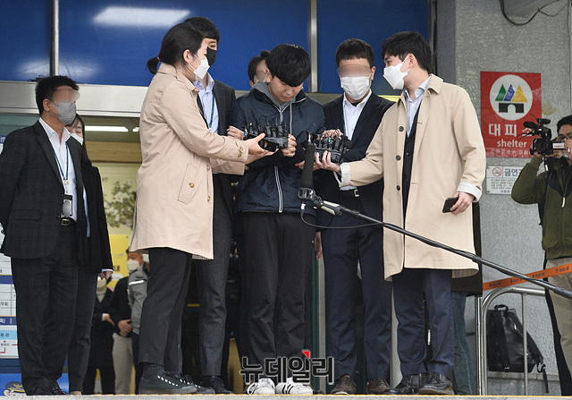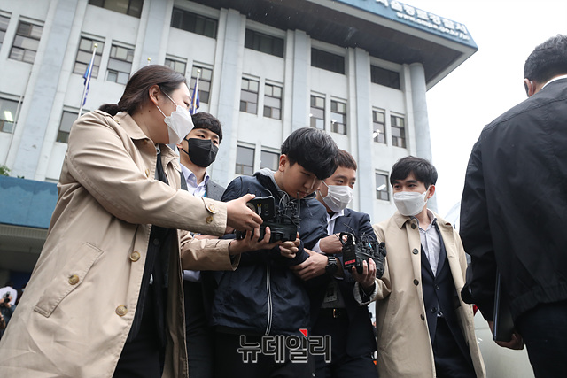 텔레그램 '박사방' 운영자 조주빈(25)의 공범 '부따' 강훈(18)이 17일 오전 서울 종로구 종로경찰서에서 검찰 송치를 위해 포승줄에 묶인 채 경찰서를 나서고 있다.