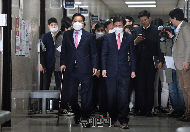 심재철 미래통합당 대표권한대행, 조경태 최고위원 등 의원들이 17일 오전 국회에서 열린 중앙선거대책위원회 해단식에 입장하고 있다.