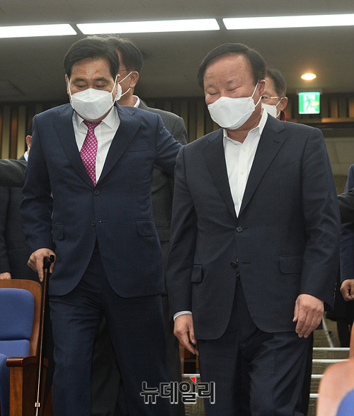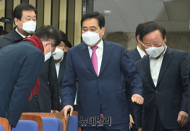 심재철 미래통합당 대표권한대행이 20일 오후 국회에서 열린 통합당 의원총회에 입장하고 있다. 의원총회는 비공개로 진행됐다.