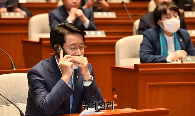 조정식 더불어민주당 정책위의장이 20일 오후 국회에서 열린 의원총회에서 누군가와 통화를 하고 있다.