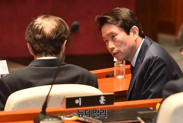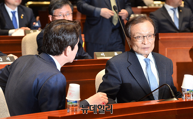 [포토] 민주당 의총, 대화하는 '이해찬-이인영'