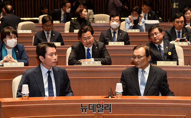 이해찬 더불어민주당 대표, 이인영 원내대표가 20일 오후 국회에서 열린 의원총회에서 대화를 나누고 있다.