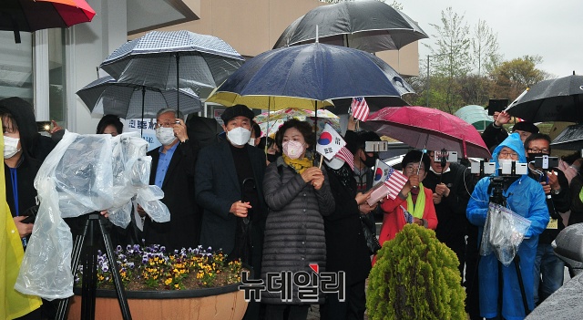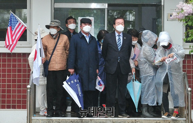 김경재 전 한국자유총연맹 총재 및 전광훈 한국기독교총연합회 대표회장 지지자들이 20일 오후 경기 의왕시 서울구치소 앞에서 전 대표회장의 석방을 기다리고 있다.