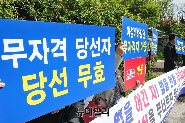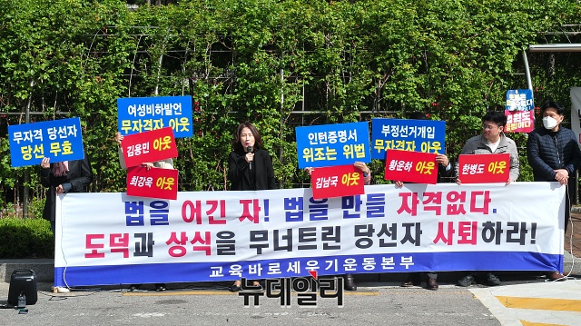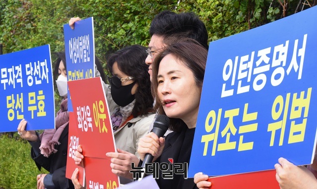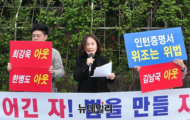 박소영 교육바로세우기운동본부 대표가 21일 오전 서울 서초구 서울중앙지법 앞에서 최강욱 전 청와대 공직비서관 사퇴촉구 기자회견을 갖고 있다.박 대표는 "인턴 증명서를 위조한 최강욱은 검찰개혁 운운하지 말고 사퇴하라"며 "총선에서 180석의 거대 여당이 된 더불어민주당은 자격 미달의 후보자를 공천해 당선시킨 데 대해 입장을 밝히고, 국민들에게 사죄하라"고 말했다.최강욱 전 청와대 공직기강비서관은 이날 오전 조국 전 장관 아들의 '허위 인턴 증명서' 발급 혐의로 서울중앙지법으로 출석했다.