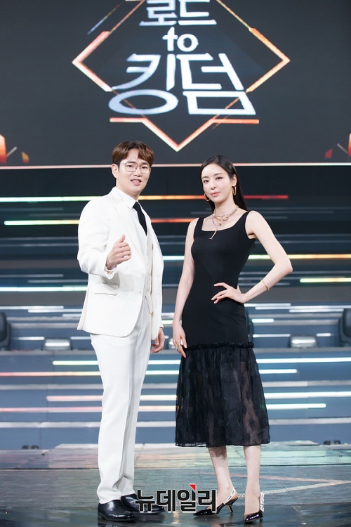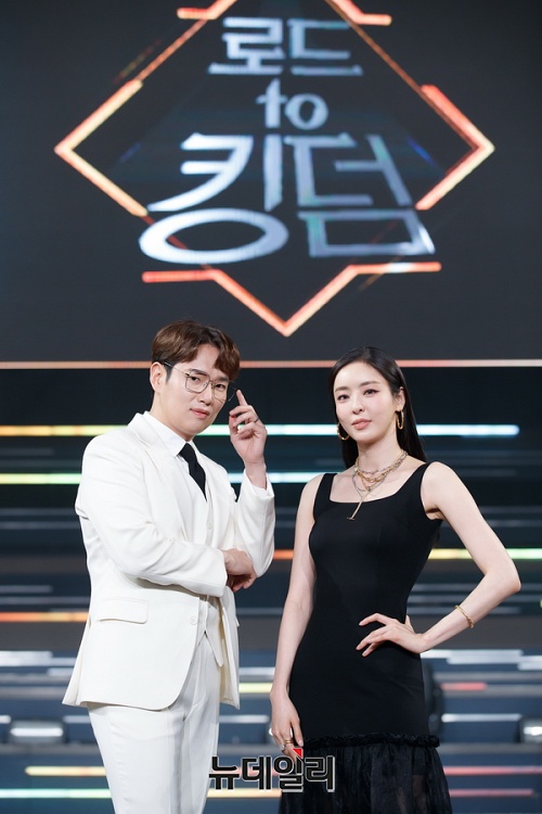 방송인 장성규(왼쪽), 이다희가 21일 오후 온라인으로 진행된 Mnet 예능프로그램 '로드 투 킹덤' 제작발표회에서 포토타임을 갖고 있다.