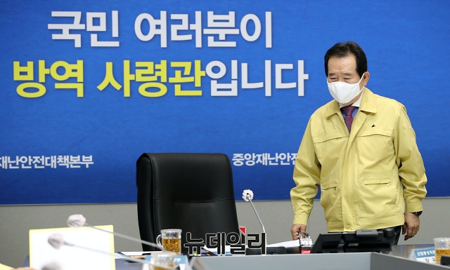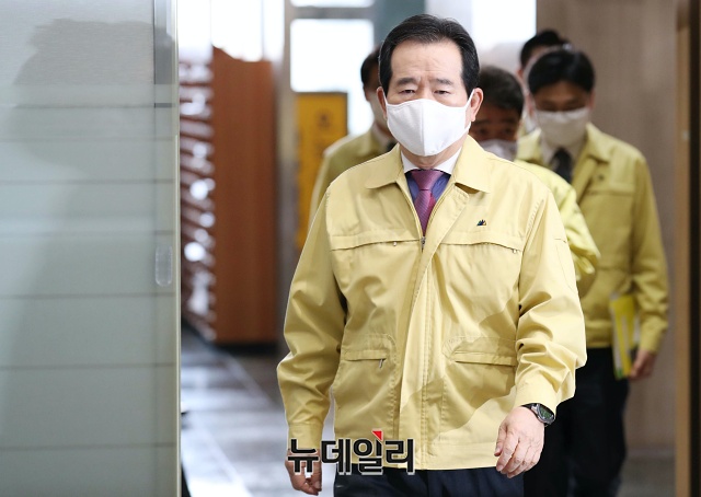 정세균 국무총리가 22일 오전 서울 종로구 정부서울청사에서 열린 '코로나19(중국 우한 폐렴)' 중앙재난안전대책본부 회의에 입장하고 있다.