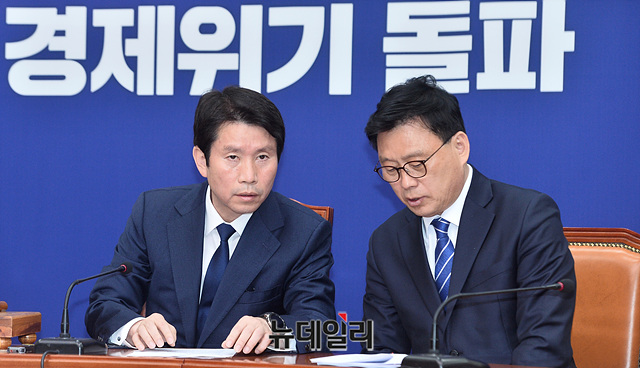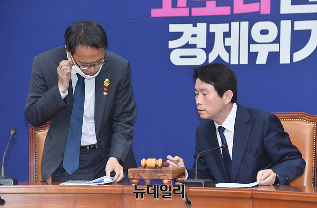 이인영 더불어민주당 원내대표가 22일 오전 국회에서 열린 최고위원회의에서 박주민·박광온 최고위원과 각각 대화하고 있다.