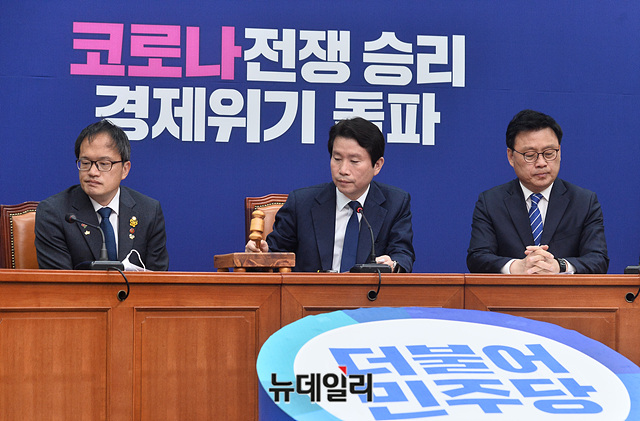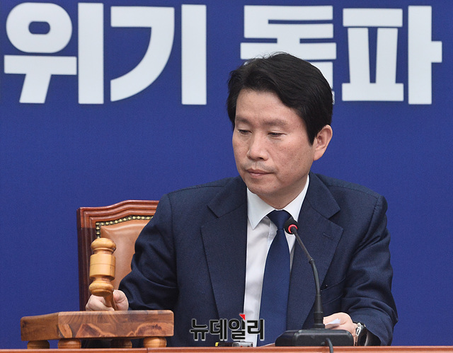 이인영 더불어민주당 원내대표가 24일 오전 국회에서 열린 최고위원회의에서 의사진행을 하고 있다.