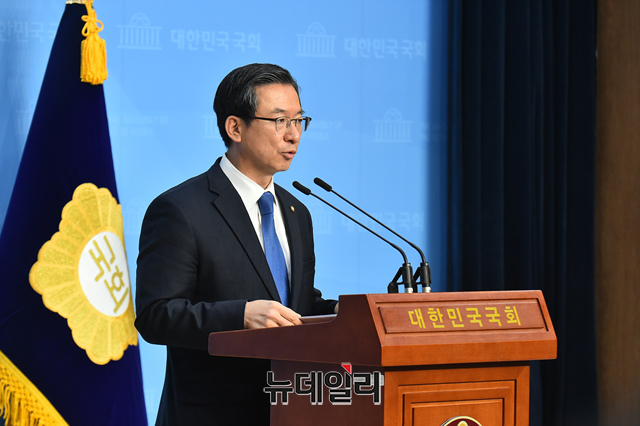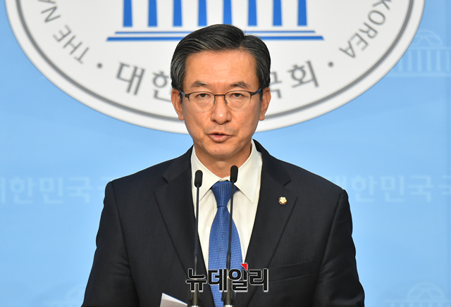 정성호 더불어민주당 의원이 27일 오전 국회 소통관에서 원내대표 출마 기자회견을 갖고 있다.