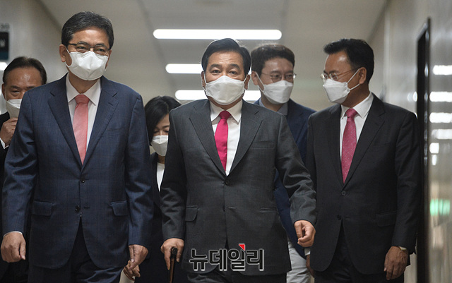 심재철 미래통합당 대표권한대행, 곽상도 미래통합당 성추문 진상조사단 위원장 등 참석자들이 28일 오전 국회에서 열린 더불어민주당 성범죄 진상조사단 회의에 입장하고 있다.