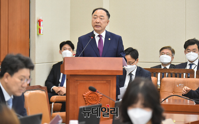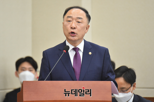 홍남기 경제 부총리 겸 기획재정부 장관이 28일 오전 국회에서 열린 기획재정위원회 전체회의에 참석해 현안보고를 하고 있다.