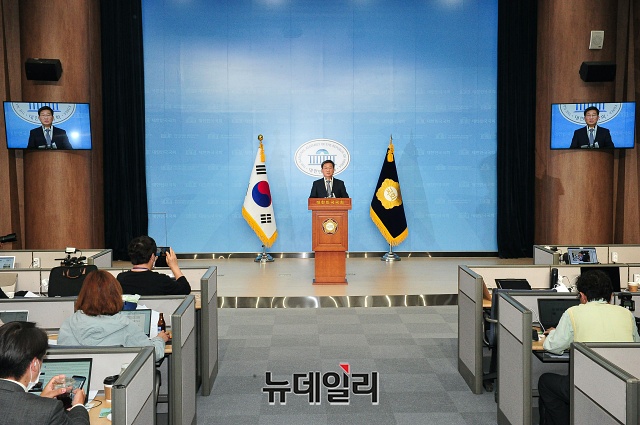 전해철 더불어민주당 의원이 28일 오후 국회 소통관에서 원내대표 출마 기자회견을 갖고 있다.