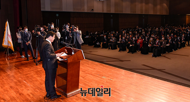 정우택 미래통합당 전국위원회 의장이 28일 오후 서울 영등포구 63스퀘어에서 열린 미래통합당 제1차 전국위원회에서 의사진행을 하고 있다.