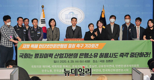 채이배 민생당 의원, 추혜선 정의당 의원, 경제정의시민실천연합, 금융정의연대 등 시민단체들이 29일 오전 국회 소통관 기자회견장에서 인터넷전문은행법 철회 촉구 기자회견을 갖고 있다.