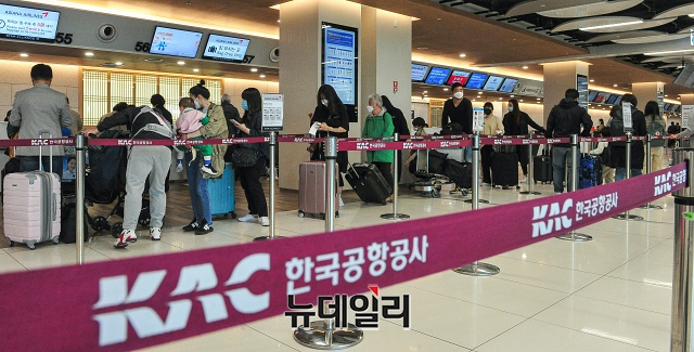 최대 6일간의 황금연휴를 앞둔 29일 오후 서울 김포공항 국내선 청사에 제주로 향하는 여행객들이 탑승수속을 밟기 위해 줄 서 있다.원희룡 제주도지사는 28일 "관광객이 오는 건 당연히 환영해야 하는데 코로나19는 오면 안된다"며 "몸에 이상이 있으면 제주 여행을 자제하시고, 여행중에 조금이라도 몸 상태가 안좋으면 바로 신고를 해달라"고 당부했다.30일부터 내달 5일까지 이어지는 황금연휴 기간 18만명의 관광객이 제주도로 몰려들 것으로 예상된다.